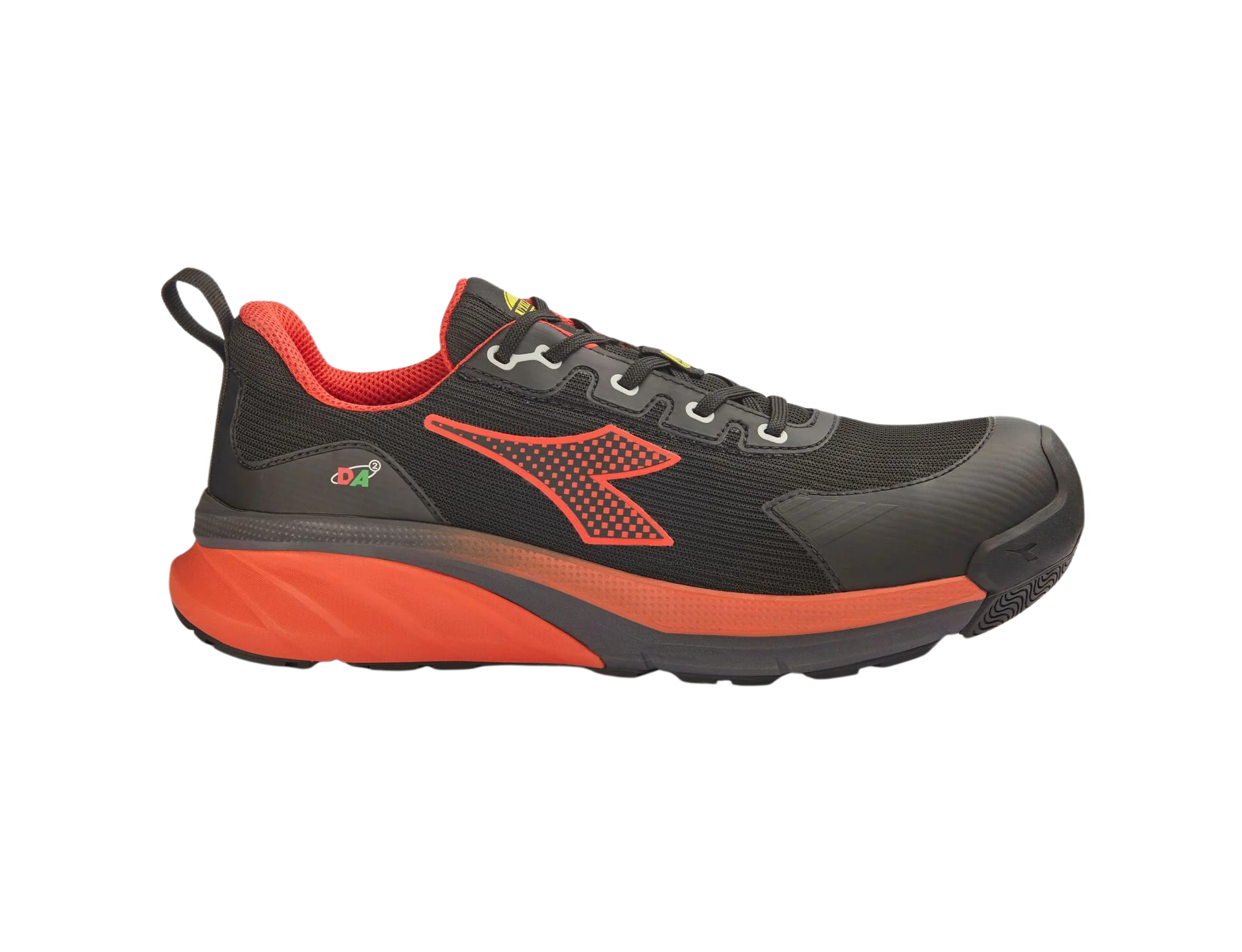 Calzatura di sicurezza bassa S3S idrorepellente in tessuto tecnico poliestere. Nera e rossa.